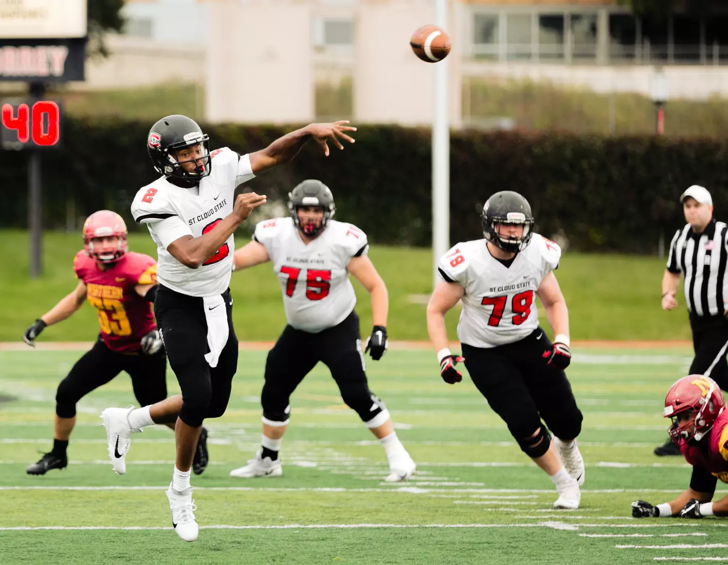 To start the second quarter the Wolves took advantage of missed coverage by scoring off a 76-yard touchdown to make the score 7-7. St. Cloud answered by marching down the field for 78-yard, seven play drive. The drive was capped off with a 4-yard touchdown from Lawhorn to Solberg. After forcing another three and out the Huskies drove the ball down the field and Adam Stage (Sr., K, Appleton, Wis.) made a 29-yard field goal to make the score 17-7. Northern State eventually ended up scoring a touchdown to make the score 17-14 with a few seconds left in the first half.